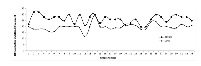 The analysis was performed using the one-sided Hypothesis Test with Standard Normal Distribution (Z) Confidence Level (CI) of 0.99. Results show that the mean RR of patients before receiving treatment with AHI was 26.3 (SD 3.3); after treatment, the mean was 19.8 (SD 2.9), with a value of p <0.00001. This represents a statistically significant RR reduction of 25%.