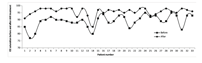 Figure 2:O2 saturation of each patient treated with AHI at the beginning and end of hospitalization. The figure shows the data of the 33 patients who had been discharged upon completion of the trial. The remaining 4 patients of the total group of 37 remained hospitalized at that time