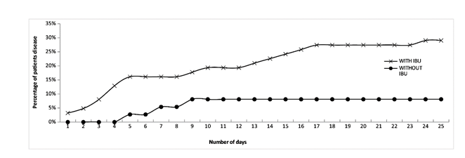 Finally, analysis of the total number of patients who died in both groups shows that 24 of the 62 patients without AHI died, which represents 38.7%. In the group of patients treated with AHI (37), only 3 died, with a mortality rate of 8.1%. This result represents a decrease of 79% in mortality in patients treated with Ibuprofen.